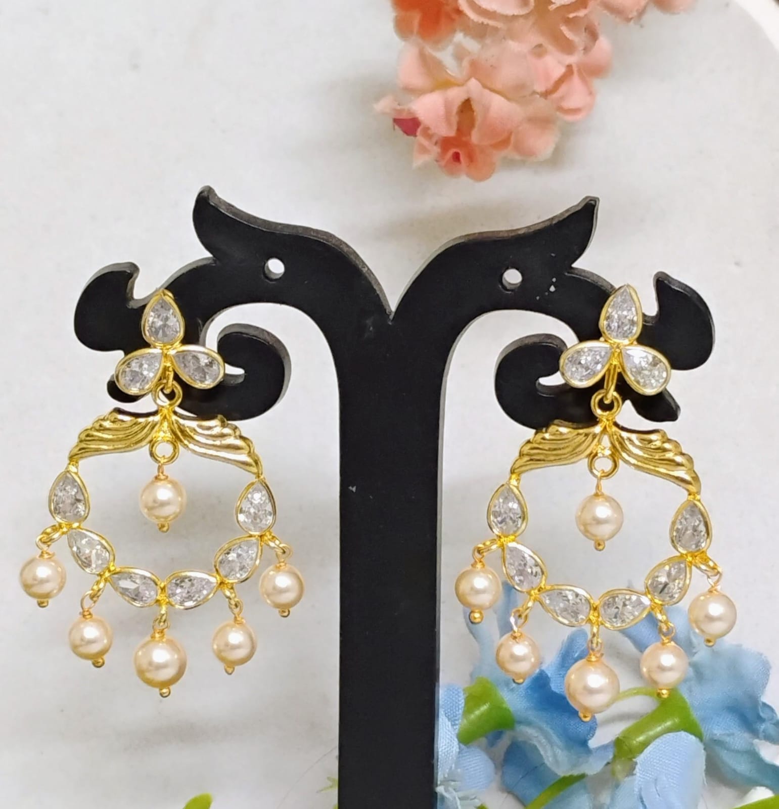 Graceful gold-plated chandelier earrings, delicate white pearls — a perfect blend of elegance and charm for festive or traditional wear.